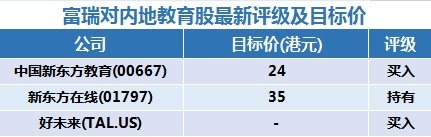 富瑞表示,同样看好新东方教育科技集团和中公教育,因两家公司具有规模效应,并且市场机遇有吸引力。该行给予新东方在线(01797)“持有”评级,目标价35港元,该公司作为后来者面临挑战,需要更多时间来在激烈的市场竞争中显示出差异性。