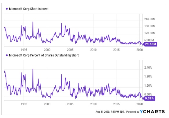 微软的股价在短短五个月内上涨了大约70%。理想的话,这会让一些(如果不是很多的话)投资者认为微软的股票已经见顶,并开始做空该公司,导致空头股数的积累,但事实并非如此。