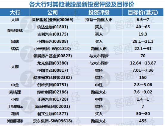 五、各大行对其他港股最新投资评级及目标价