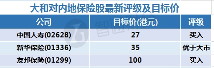 一、大和对部分内地保险相关股最新投资评级及目标价