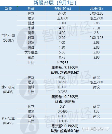 智通财经APP获悉,百胜中国(09987)、濠江机电(01408)、科利实业(01455)正在招股中。截止至9月2日,耀才 、辉立、信诚等券商分别为其借出75.55亿港元、0.2255亿港元和0.2606亿港元。其中,百胜中国超购逾8.6倍,科利实业超购逾0.3倍,濠江机电尚未足额。
