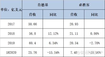 数据显示,肯德基营收增速从2018年的12.12%下降至2019年的6.34%,业绩增速出现放缓的迹象。必胜客2018年基本上没有增长,2019年便出现了负增长。