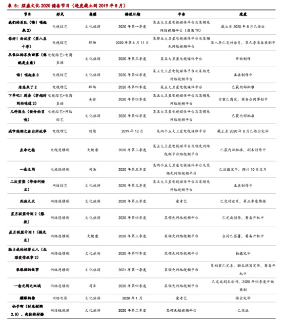 以往,煜盛文化将资源集中于电视综艺节目,未来战略层面将依托美食、职场、科技、大健康、文化旅游、司法6大核心节目类型,继续扩充和多元化节目组合,并计划于2020年推出9部电视综艺、2部电视剧,6部网络电视剧、1部网络电影及1部网络系列短视频,节目数量同比增长近100%。