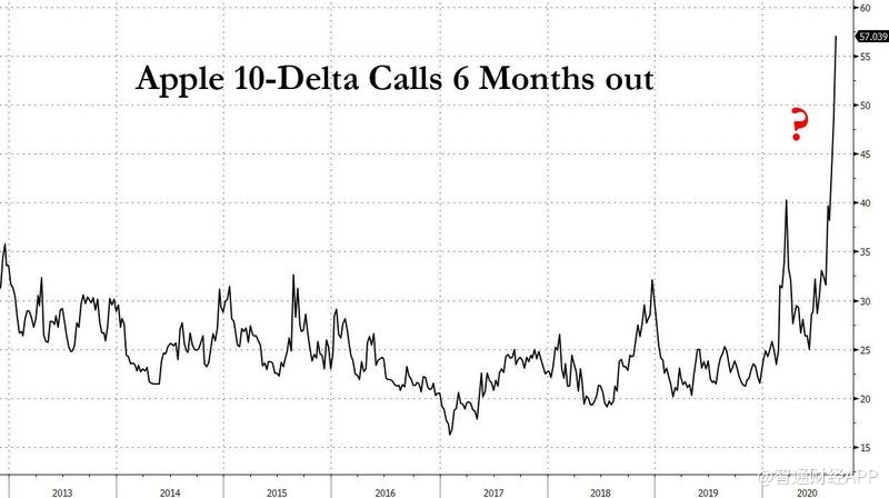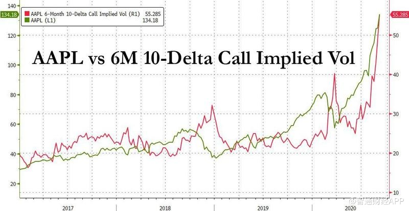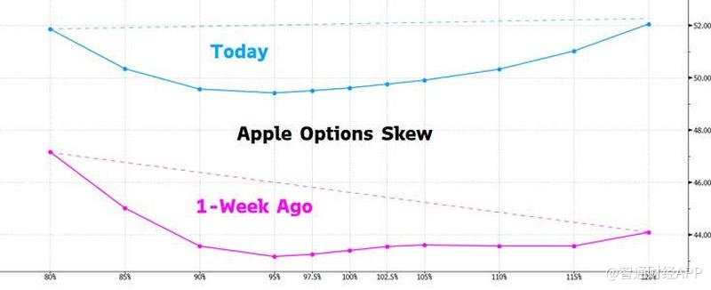 他表示,仅在过去一周内,苹果价外看涨期权的隐含波动率已经上升到与价外看跌期权的隐含波动率相当。如果做市商自己卖出看涨期权,就必须通过买入标的股票来进行对冲。在较高的隐含波动率水平下买入更多的看涨期权,意味着交易商需要买入更多苹果的股票。