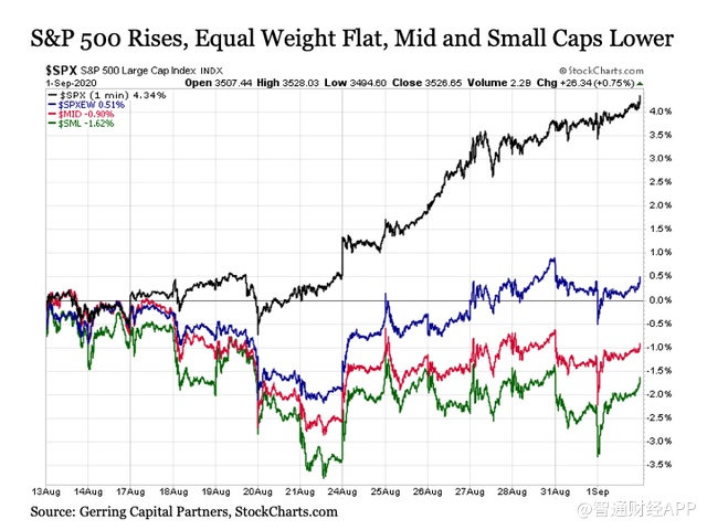 美国股市不断刷新历史新高,而推动美股上涨的个股却越来越少。作为近期市场广度变得狭窄的诸多迹象之一,如下图所示,自8月13日以来,虽然头部标普500指数已经飙升超过4%,但等权标普500指数涨幅勉强为正,而标普中型股400指数和标普小型股600指数则下跌约1%至2%。