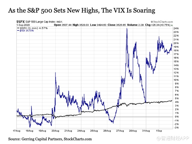 市场本身已经发出了对潜在下行调整的恐惧信号。近期标普500指数屡屡刷新历史新高,而此时CBOE波动率指数(即恐慌指数VIX)却一直在飙升。至此,虽然标普500指数自8月17日以来上涨4%,但同期恐慌指数VIX却大涨20%。