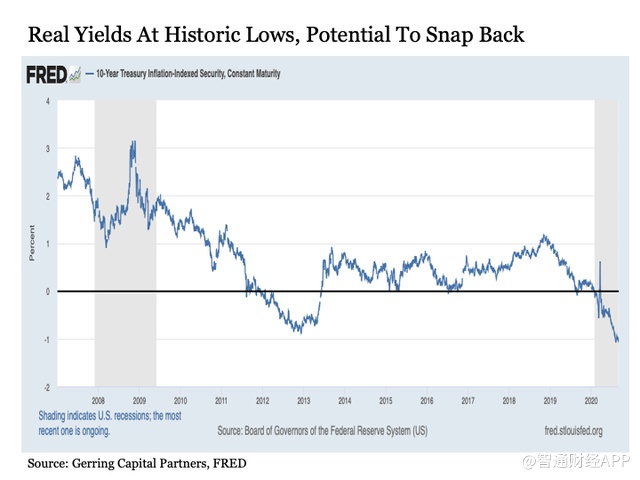 10年期美国国债收益率周二收于0.68%,同时,10年期美国国债盈亏平衡通胀率为1.76%。这意味着,今天持有10年期美国国债的投资者,在考虑到未来十年的通胀预期后,所获收益率为-1.08%。如下图所示,这是自千禧年以来历史上最低的负实际收益率。