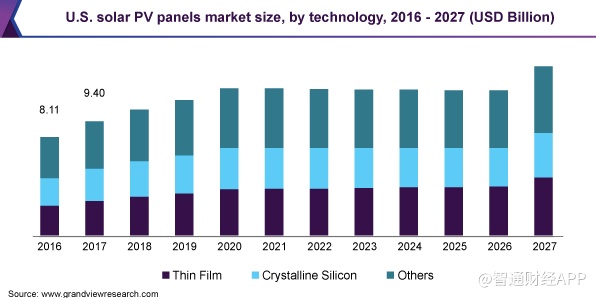 目前全球太阳能市场规模为1150亿美元,美国市场规模约为100亿美元。预计这两个市场都将以中等个位数的年增长率增长。2016年,特斯拉以26亿美元收购了SolarCity,从而在这一市场站稳了脚跟。从那时起,该公司继续致力于太阳能屋顶等项目。