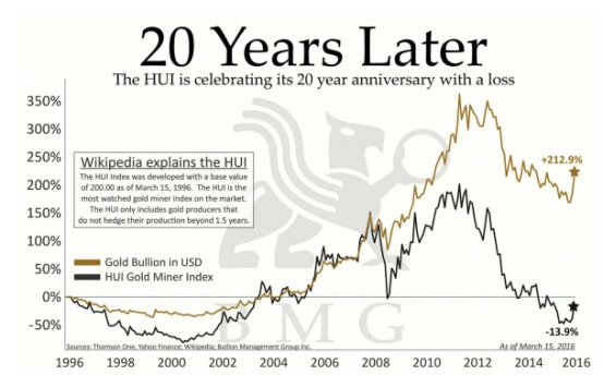 上图衡量了“金甲虫”指数(HUI)和黄金的回报率。在过去20年里,黄金的表现大大超过了这些金矿商,指数高于黄金的情况很少。2016年,当下降趋势逆转时,他们回报率的差值达到了极点。