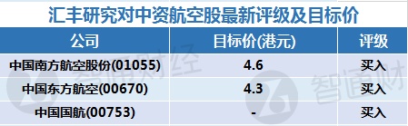 二、汇丰研究对中资航空股的最新投资评级及目标价