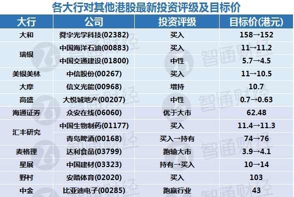 五、各大行对其他港股最新投资评级及目标价