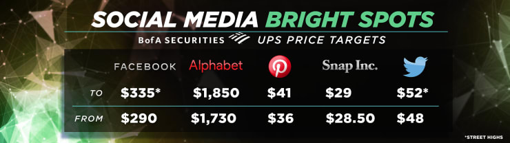 目前美银证券于9月1日分别上调Facebook(FB.US)、谷歌(GOOG.US)、Pinterest(PINS.US)、snap(SNAP.US)、Twitter(TWTR.US)的股份目标价;美银证券据此称社交媒体仍然是行业增长态势中的绝对组成部分,而Instagram、Twitter以及snap在八月份的下载量都实现了不同幅度的同比增长。目前美银证券对Facebook以及Twitter的目标价再创新高。