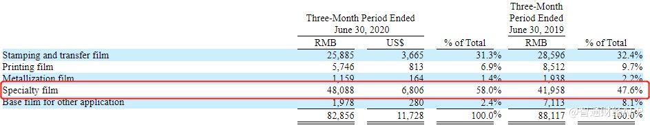 特种薄膜销售额4808.8万元,占总销售额的58%;去年同期为4195.8万元,占总销售额的47.6%。