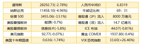 1、美国上周首次申领失业救济人数虽然再度下滑,但市场认为数据仍有部分不确定性,拖累美股周四急泻。在科技股大跌影响下,美股低开低收,道指盘中一度跌逾千点,收跌807.77点或2.78%,报28292.73点;标普500指数收跌3.51%,报3455.06点;纳指收跌4.96%,报11458.1点。港股ADR指数收报24586点,跌422.52点或1.72%。