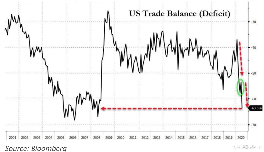智通财经APP获悉,美国商务部的数据显示,美国商品和服务贸易逆差从6月份修正后的535亿美元扩大至7月份的636亿美元。这明显比预计的580亿美元的贸易逆差更糟,是自2008年以来最大的贸易逆差。分析师表示,尽管美国“V型”复苏的希望依然存在,但7月糟糕的贸易逆差数据表明,美国复苏的进程并不理想。