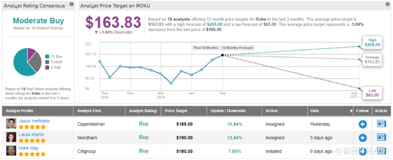 尽管Roku的股价暂时受挫,但Needham五星级分析师Laura Martin依然看好Roku,给予该股“买入”评级,目标价190美元。
