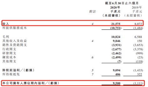 具体而言,今年上半年,该公司实现营收约为2158万美元,较2019年同期807万美元同比增长167%;实现归母净利润为950万美元,扭亏为盈。每股盈利2.23美仙,不派中期息。