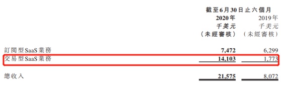 而如财报所说的,今年上半年,阜博集团的交易型SaaS业务的确是比较抢镜。财报显示,期内,该公司订阅型SaaS业务实现收入747.2万美元,同比增长了18.6%;交易型SaaS业务则实现收入1410.3万美元,同比增长695.4%,增长速度不抢镜都不行。