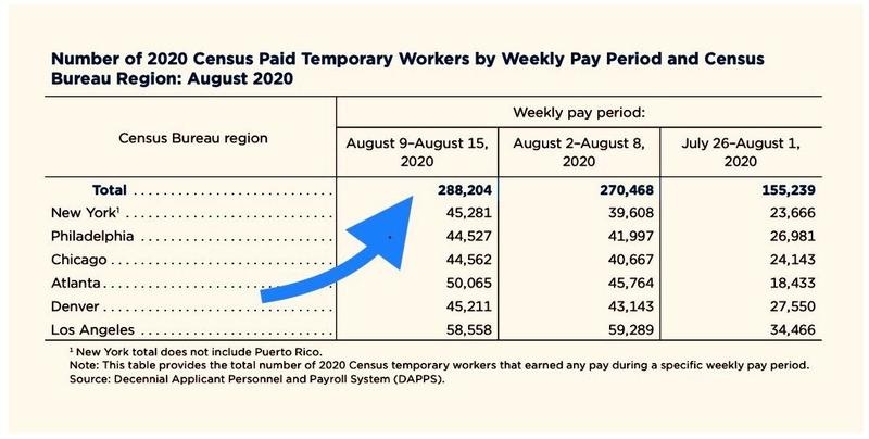 美国人口普查局近期发布了2020年人口普查带薪临时工的最新信息。在此次普查中,人口普查局雇用了大量临时人口普查员。在7月就业报告参考周(从7月12日到7月18日)中,政府雇用了大约50000名工人,而在8月参考周(从8月9日到8月15日),这一数字跃升至288204。