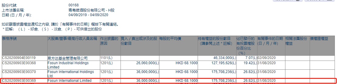 智通财经APP获悉,香港联交所最新资料显示,8月31日,复星国际减持青岛啤酒(00168)3600万股,每股作价68.1港元,总金额约为24.52亿港元。智通财经APP获悉,减持后最新持股数目为1.76亿股,最新持股比例为26.82%。