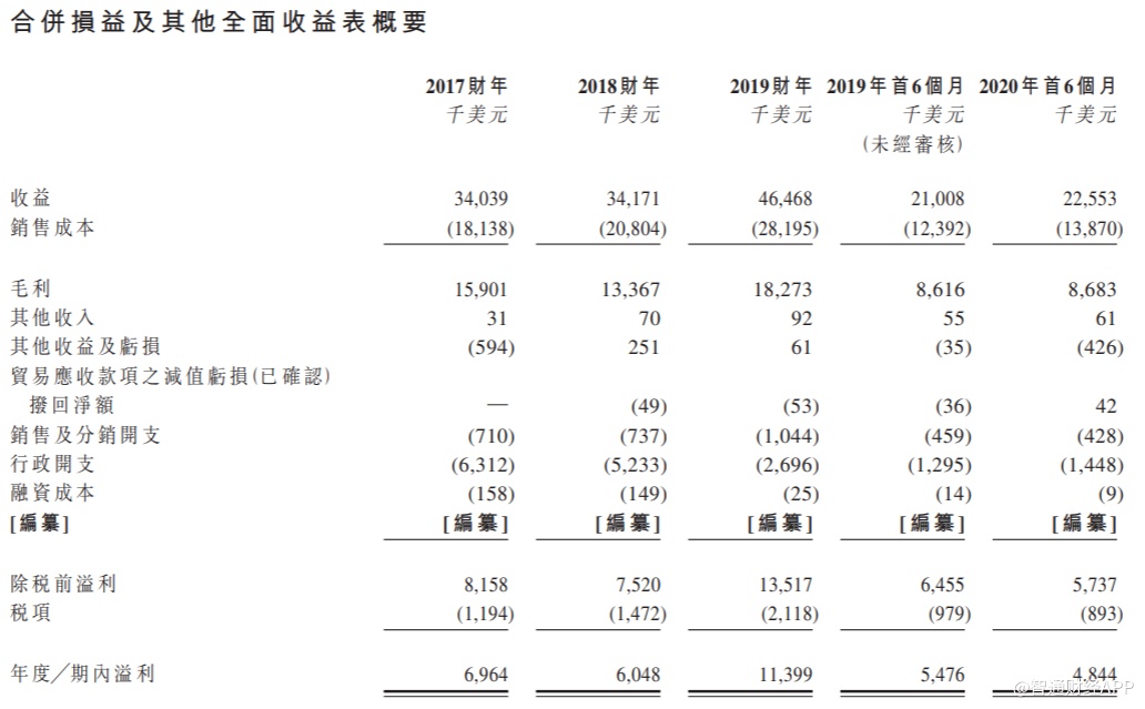 2017财年、2018财年及2019财年,公司的总收益分别为3400万美元、3420万美元及4650万美元,截至2019财年止三年复合年增长率 为16.9%,而公司的相应年度纯利分别约为7百万美元、6百万美元及1140万美元。