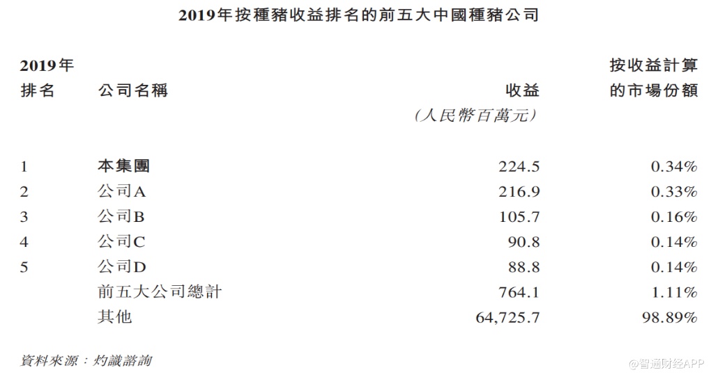 根据灼识咨询报告,于2019年、 2018年及2017年,就种猪销售收益而言,天兆猪业在中国所有的种猪养殖公司当中分别排行第一、第四及第二。其中,2019年的市占率达到0.34%。