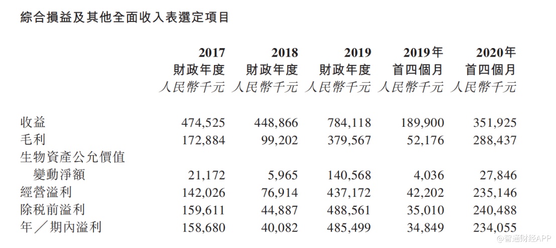 于2017财政年度、2018财政年度、2019财政年度及2020年前四个月,天兆猪业分别向其客户销售约23.81万头、22.47万头、27.74万头及7.38万头猪。同期,公司分别实现收入4.74亿元人民币(单位下同)、4.49亿元、7.84亿元和3.51亿元,保持良好增速。