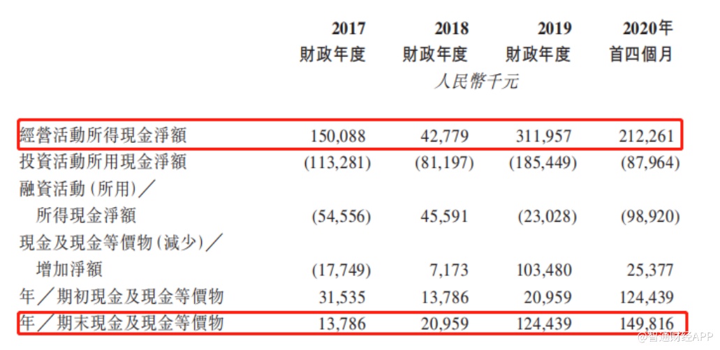 2019年和2020年前四个月,公司经营活动所得现金净额分别达到3.12亿元和2.12亿元,同期期末现金及现金等价物分别为1.24亿元和1.5亿元,较过往年份均有明显改善。