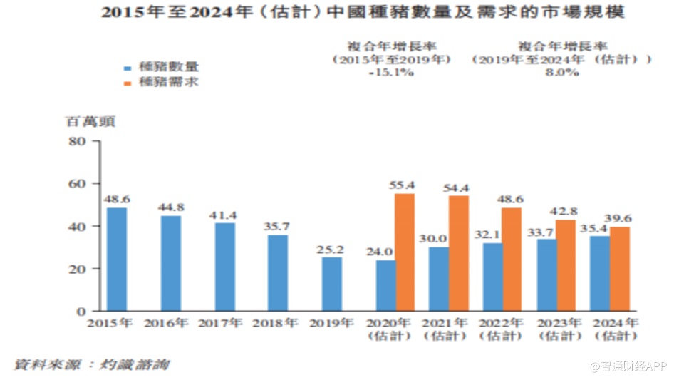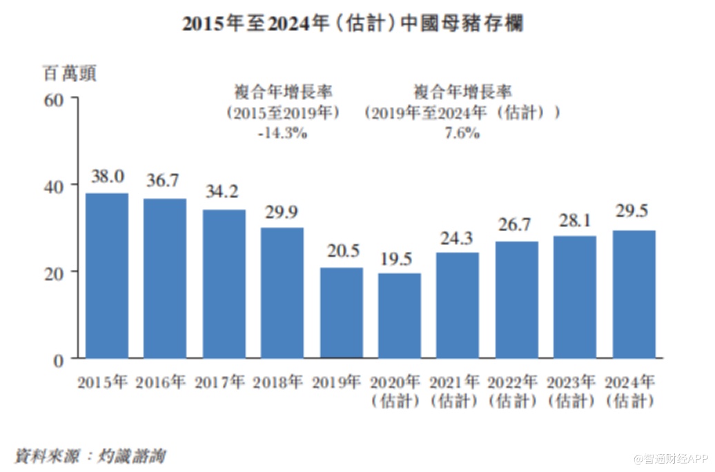 商品猪及猪肉终端销售价格提升,必然向上游传导提升能繁母猪养殖规模。据灼识咨询报告,2020年,中国母猪存栏量将缩减至19.5万头,下探至底部区域。随后母猪存栏量将以7.6%的年均复合增长率提升至2024年的29.5万头。