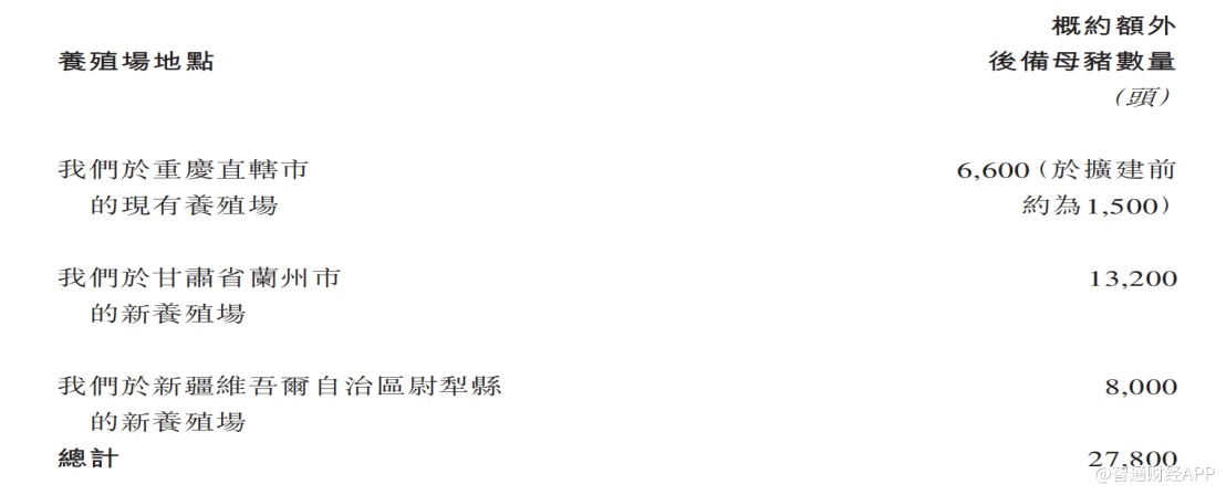 据天兆猪业招股书,公司正在筹划在重庆直辖市、甘肃省和新疆维吾尔族自治区新建养殖场。公司预期,上述新猪只养殖场建设完成并开始营运后,年度最大猪只出栏产能将增加约44.48万头,较公司于2020年1月1日的现有最大出栏产能增加约126%。