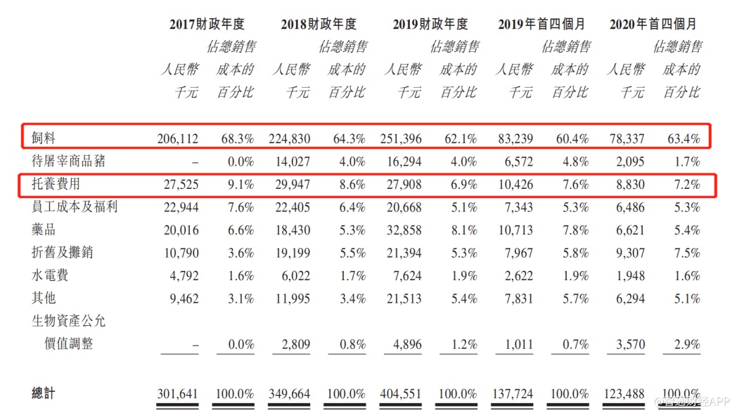 据智通财经APP了解,猪只养殖行业最大的主要成本包括饲料成本、人工成本、养殖场建设成本、运输成本等等,其中饲料成本约占猪只养殖成本的50%。天兆猪业招股书显示,截至2020年前四个月公司饲料成本占销售收入比重达到63.4%。