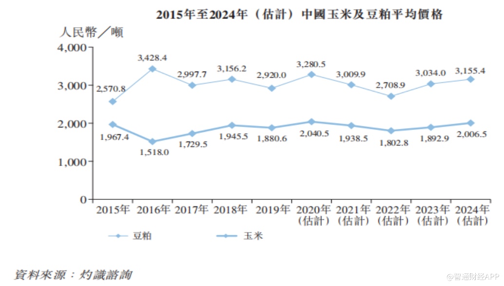 据灼识咨询报告,未来四年饲料中主要成分豆粕价格将围绕1900元/吨上下波动,而玉米价格将围绕3000元/吨上下波动。