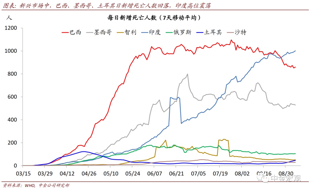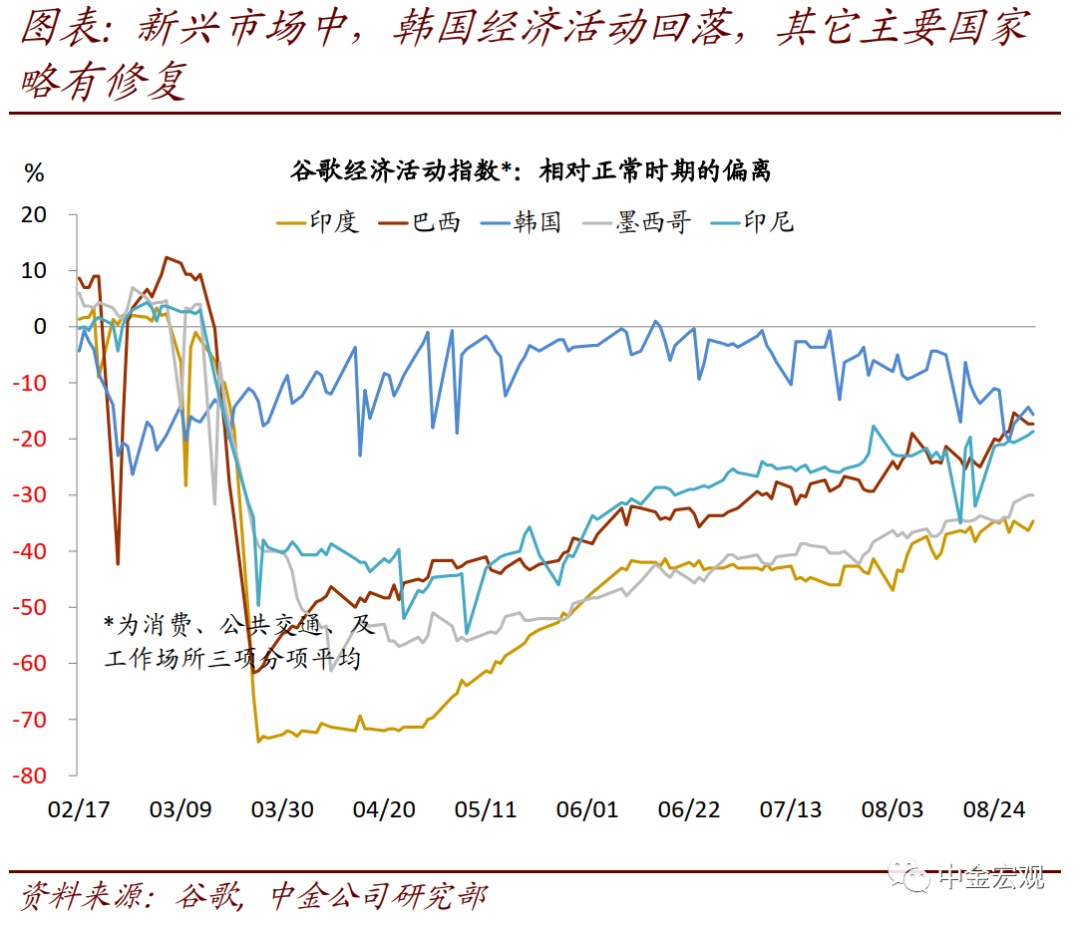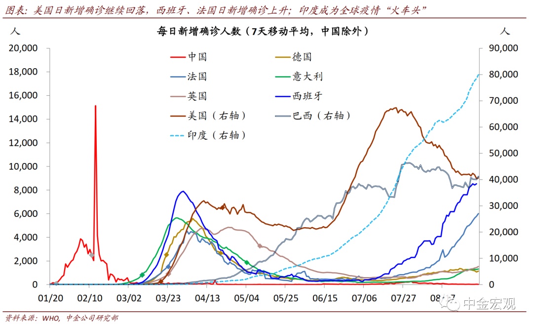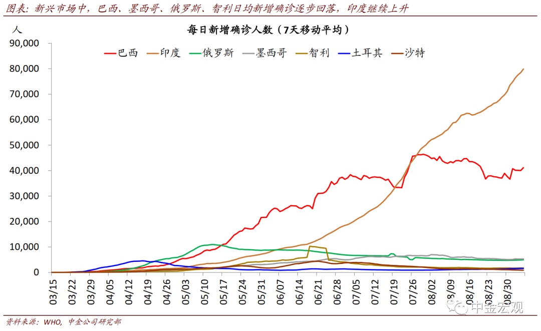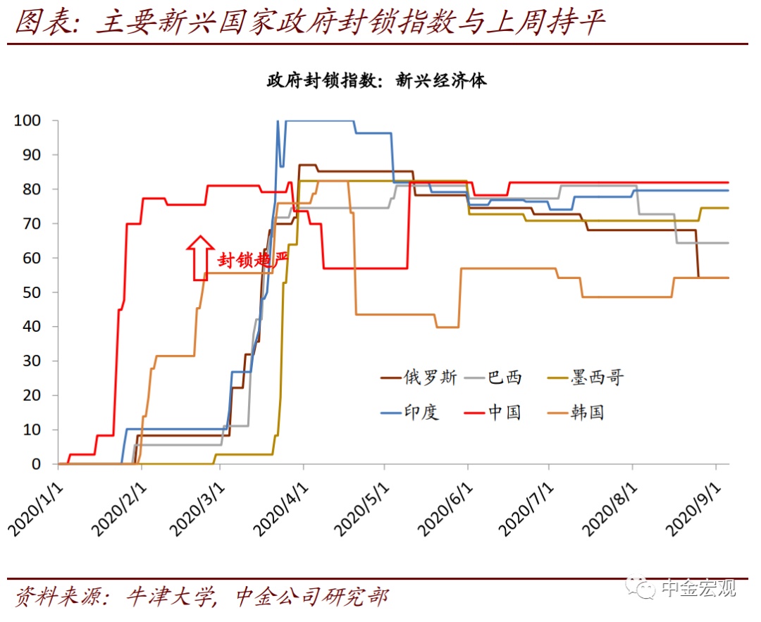 全球公共卫生事件:欧洲公共卫生事件二次”反弹继续,但经济活动受影响程度有限。根据约翰霍普金斯大学数据,截至北京时间9月6日中午12点,全球公共卫生事件累计确诊26,882,530人。上周的边际变化包括:1)欧洲国家公共卫生事件继续反弹,但与第一次公共卫生事件大不相同。法国和西班牙日新增分别超过9千和1万人,已经高于4月公共卫生事件高峰时期;意大利上周反弹力度也加大,日新增超过1700人。不过,此次公共卫生事件各国重症率和死亡率并不高,与第一次大不相同,且老年人也增强了自身防护,因而政府采取的封锁措施也相对有限;相应地,公共卫生事件反弹对居民出行的影响似乎有限。我们看到欧洲居民出行在8月短暂下滑后,近期重新回升;2)新兴市场焦点依然在印度,其公共卫生事件继续加剧,日新增继续上升至8.6万人左右;累计确诊人数达411万人,逼近巴西的412万人;3)美国压力继续缓解。其上周日新增确诊平均为4.06万人,相比前一周的4.1万人继续回落,确诊比例也在波动中回落至5.6%左右。我们继续强调,在没有疫苗或者特效药之前,全球公共卫生事件的不断反复难以避免;但对此的担忧也不宜过度。在政府及时应对、且民众具备更丰富预防公共卫生事件经验背景下,公共卫生事件大规模反弹可能性较小;从美国7月~8月经验看,即使反弹,政府也能以相对较小的经济代价再度控制公共卫生事件。