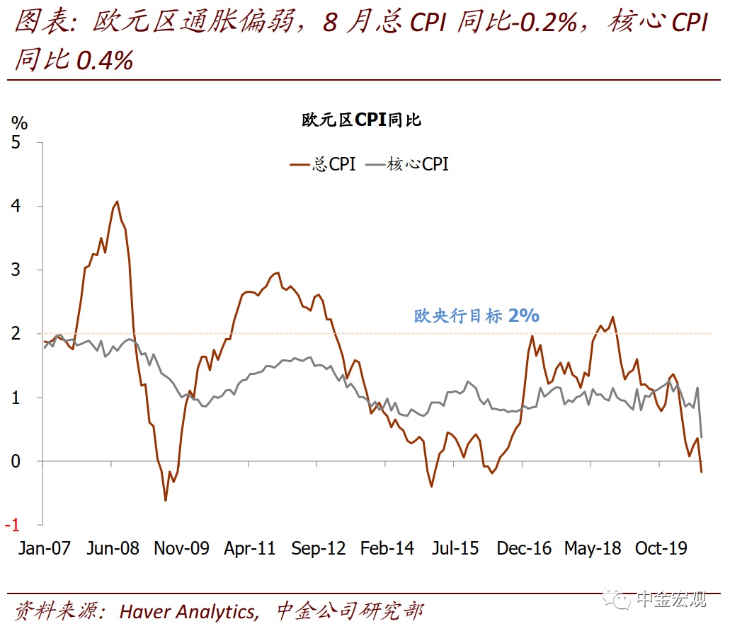 2. 政策立场:继续鸽派,但PEPP暂时不动。我们预计,虽然5月解封以来欧洲增长不错,但近期的一些发展,将继续令欧央行强调“风险依然偏向下行”,政策立场偏鸽派:1)近期欧洲公共卫生事件二次反弹,法国和西班牙日新增分别超过9千和1万人,已高于4月公共卫生事件高峰期;2)欧元区通胀继续偏弱。8月总CPI同比-0.2%,为2016年以来首次;核心CPI同比0.4%,则是欧元区1999年建立以来最低。