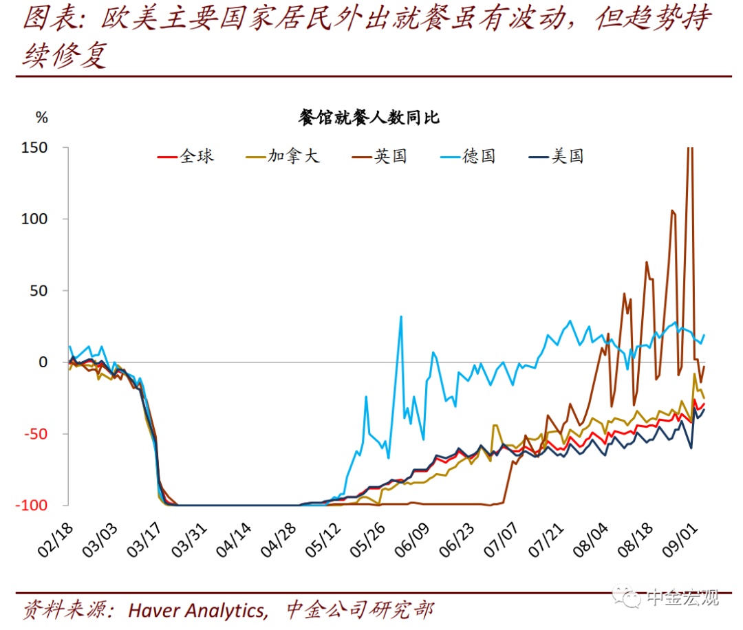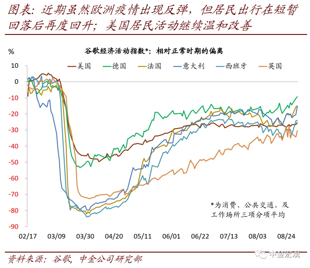 经济基本面:全球制造业、美国就业继续温和改善。虽然欧美及部分新市场依然面临公共卫生事件带来的不确定性,但数据显示,全球经济继续彰显韧性,温和复苏。其中,8月Markit全球制造业PMI指数终值51.8,相比7月的50.6继续上升,也是连续第二个月处于50这一荣枯线以上,显示全球商品消费的修复正在推动制造业复苏。另外,美国8月新增非农就业137.1万人,虽然相比上月的173.4万略有回落,但延续改善趋势;8月失业率8.4%,相比上月的10.2%显著回落,显著好于市场预期的9.8%。高频数据看,欧美复苏趋势正在延续甚至略有加速:近期欧美居民消费及工作出行回升,餐饮业修复,生产活动继续改善。