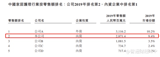 根据灼识咨询的资料,公司于2015年至2019年过往五年各年均在中国家居护理行业国内企业中位列第一,并在中国家居护理行业全部公司中位列第二,仅次于宝洁。以零售额计,公司于2019年的市场份额为9.4%。
