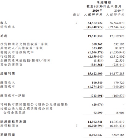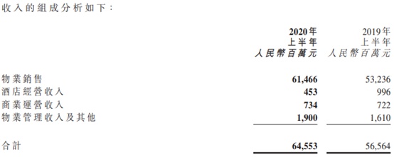 计入财务报表数据方面,公司多项业务强势表现带动营收规模上行。智通财经APP了解到,公司营收组成主要包括物业销售、商业运营、酒店经营及物业管理等四大业务,其中营收占据绝对比重的物业销售部分,得益于2020上半年入账销售面积同比增长16.6%至395万平方米,15562元平均入账销售价格也基本维持稳定,使得物业销售营收贡献同比增长15.5%至614.66亿元。与此同时,公司除最受影响的酒店收入出现下滑外,商业运营、物业管理分别录得1.7%、18%同比增长至7.34亿元、19亿元,带动营收总规模达到645.53亿元,同比增长14.1%。