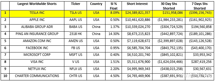 特斯拉是世界范围内做空规模最大的股票,空头头寸达244亿美元,做空股数为5993万股,占其总流通股数的8.09%。特斯拉的股票借贷手续费仅为0.30%,是借贷利率最便宜的股票。