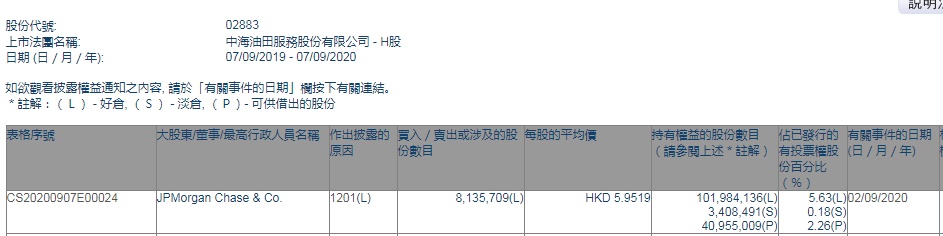 智通财经APP获悉,香港联交所最新资料显示,9月2日,摩根大通减持中海油田服务(02883)813.5709万股,每股作价5.9519港元,总金额约为4842.29万港元。减持后最新持股数目为1.02亿股,最新持股比例为5.63%。