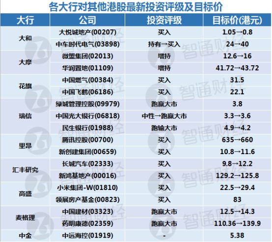 四、各大行对其他港股最新投资评级及目标价