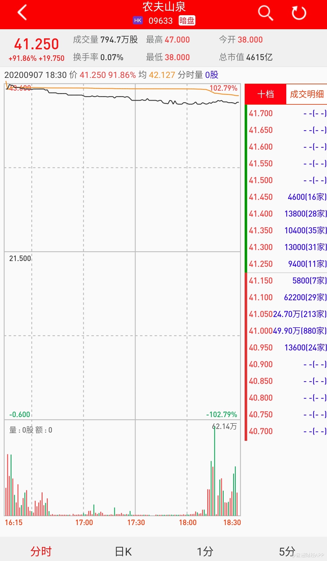 智通财经APP获悉,农夫山泉(09633)将于9月8日挂牌,截至暗盘收盘,利弗莫尔证券资料显示其暗盘报价41.25港元,较招股价21.5港元涨91.86%。每手200股,不计手续费,每手赚3950港元。
