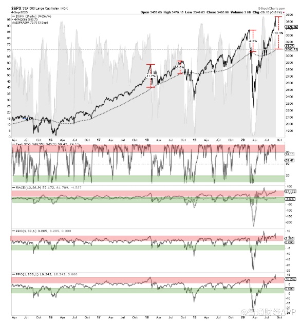 此外,Roberts强调,长期偏离的问题仍然存在。偏离的程度如此之大,以至于需要数天到数周的修正才能摆脱极端。正如图所示,上周的下跌几乎不明显,对扭转长期超买状况也没有太大的作用。