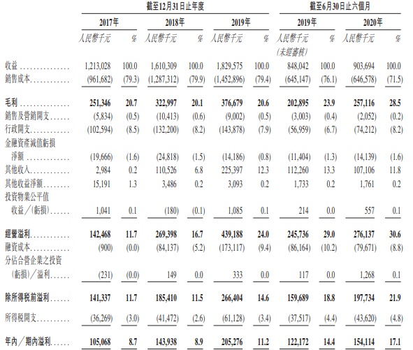 截至2017年、2018年及2019年12月31日止年度以及截至2020 年6月30日止六个月的净利润分别为人民币1.05亿元、人民币1.44亿元、人民币2.05亿元及人民币1.54亿元。于2018年增加主要是由于所有业务线的收益均有所增加,与公司业务增长相一致。于2019年增加主要是由于收益增加以及采取各种成本控制措施令毛利率有所增加。