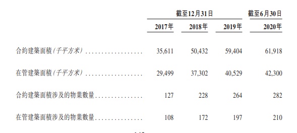 截至2017年、2018年及2019年12月31日及2020年6月30日,在管建筑面积分别为2949.9万平方米、3730.2万平方米、4052.9万平方米及4230万平方米。物业管理服务收益增加,乃主要由于因拓展业务导致在管建筑面积增加所致。