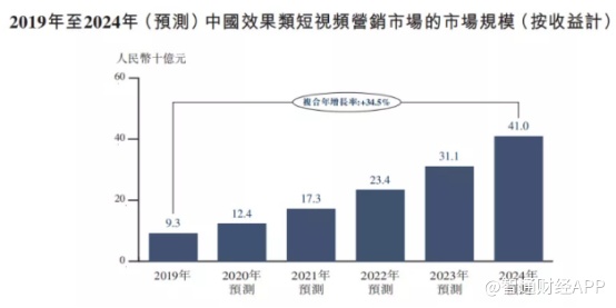 目前市场对短视频变现市场增长预期较为乐观。2019年,短视频自媒体效果类自媒体营销的市场规模为93亿元,预计于2024年将达410亿元,2019年至2024年的复合年增长率为34.5%。