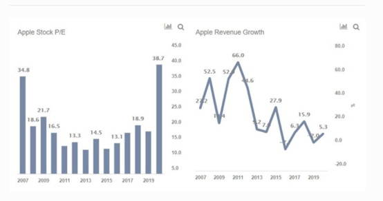 苹果2020年预期的市盈率约为37倍,而2019年的市盈率仅为17倍。上一次达到这样的水平是在2007年,当时第一部iPhone发布,苹果的收入在接下来的5年里以45%的复合年增长率增长。