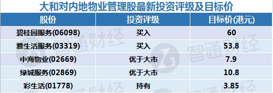 大和表示,内地物管业仍充满潜在机会,预计内地物管业将持续制定扩张计划,同时业界还将积极寻找新的增长动力,预期物管业毛利将会普遍下降,以扩张新服务业务和并购,并且相信高盈利的增值服务将会持续保持强劲增长。