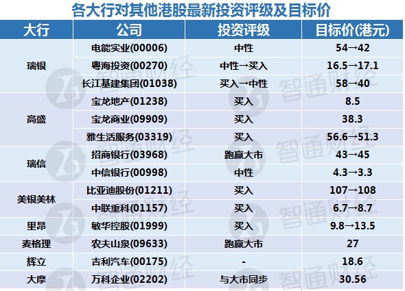 四、各大行对其他港股最新投资评级及目标价