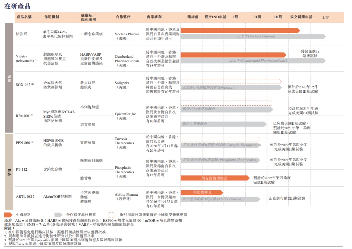 此外,公司已通过授权引入方式搭建了一条涵盖早期至晚期候选药物的均衡产品管线。
