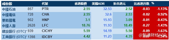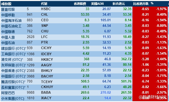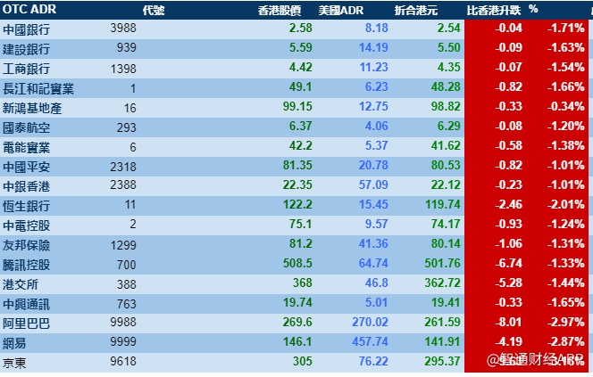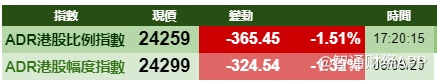 智通财经APP获悉,周二美股大跌,港股ADR指数下挫,按比例计算,收报24259点,跌365.45点或1.51%。